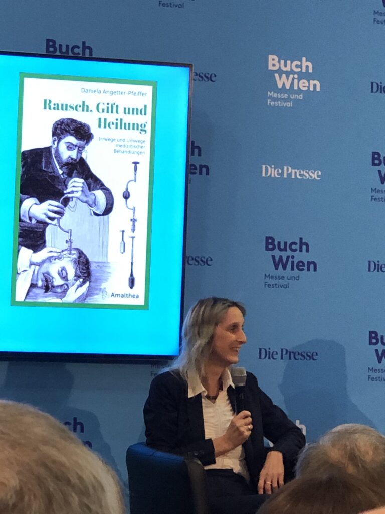Um 16.30 begann dann der Vortrag ,,Rausch, Gift, Heilung. Irrwege und Umwege medizinischer Behandlungen“ von Daniela Angetter-Pfeiffer. Im Vortrag ging es um die Entwicklung der Medizin über die Jahrhunderte hinweg. Angetter-Pfeiffer erklärte, wie medizinische Methoden von damals noch heute angewendet werden. Es wurden früher Pflanzen, die auch als Rauschmittel verwendet wurden, in der Medizin benutzt. Auch heute noch wirken bestimmte Pflanzen sowie Cannabis positiv in der Medizin. Besonders interessant war die Erklärung zur Anwendung der Lobotomie und den Unterschied zum Gebrauch in verschiedenen Bereichen.