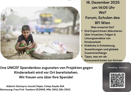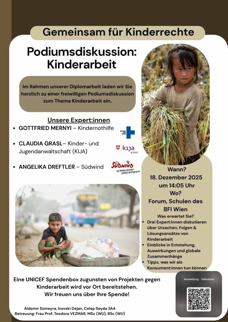 Aus diesem Grund veranstalten Sümeyra Aldemir, Dejan Inovski und Seyda Celep welche den 3 AUL besuchen am 18. Dezember 2025 eine Podiumsdiskussion. Diese findet von 14:05 im Forum an der Schule des BFI in der Margaretenstraße 65 statt. Dabei sind drei Experten, Gottfried Mernyi von der Kindernothilfe, Claudia Grasl von der Kinder- und Jugendanwaltschaft (Kija) und Angelika Dreftler vom Südwind, zur Diskussion eingeladen und informieren die jungen Schüler und Schülerinnen über die grausame Welt der Kinderarbeit. Die Experten diskutieren über die Ursachen, Folgen & Lösungsansätze der Kinderarbeit und betonen, wie komplex und vielschichtig dieses globale Problem ist.
