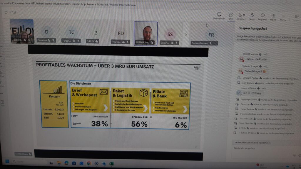 Neben den Vorträgen bot der Tag der Logistik auch zahlreiche Möglichkeiten zum online-Networking. Wir hatten die Gelegenheit, VertreterInnen der Unternehmen online Fragen zu stellen. Diese Gespräche waren unglaublich wertvoll, da sie uns nicht nur einen Einblick in die Berufswelt der Logistik gaben, sondern auch Kontakte für zukünftige Projekte und Karrierewege unserer IT-SchülerInnen eröffneten.