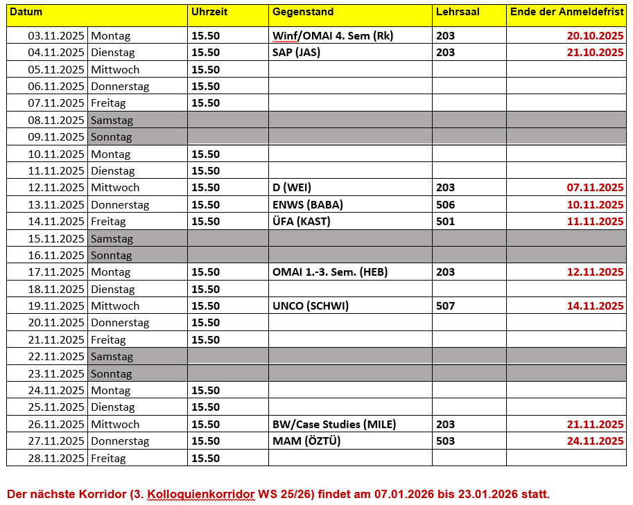 2. Korridor Wintersemester: November (je nach Ferien auch November/Dezember)