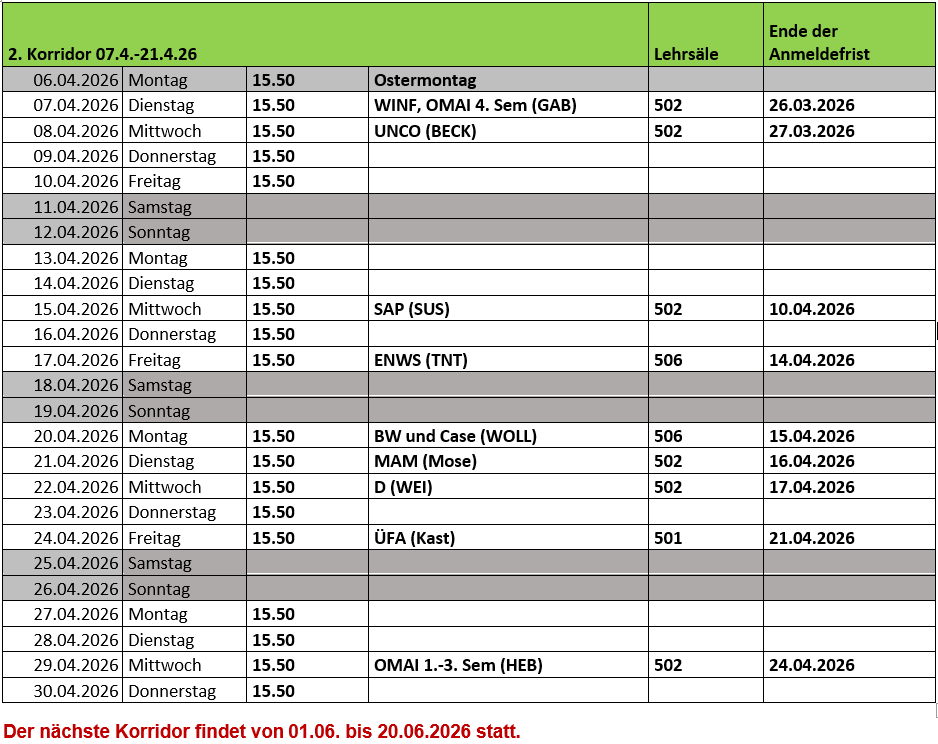 3. Korridor Sommersemester: Juni (je nach Ferien auch Mai/Juni)